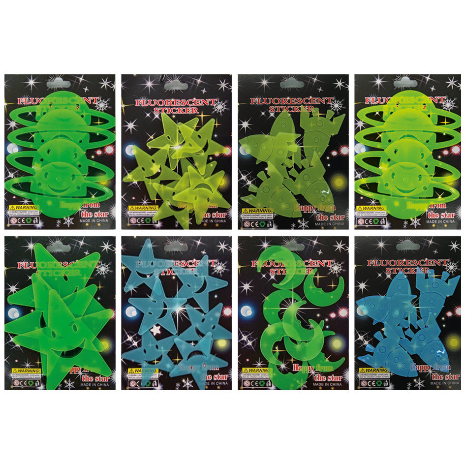 Fluoriserende figurer som kan festes på vegger og tak for å lage en spennende atmosfære. 8 pakker med til sammen 42 figurer. 4-10cm.